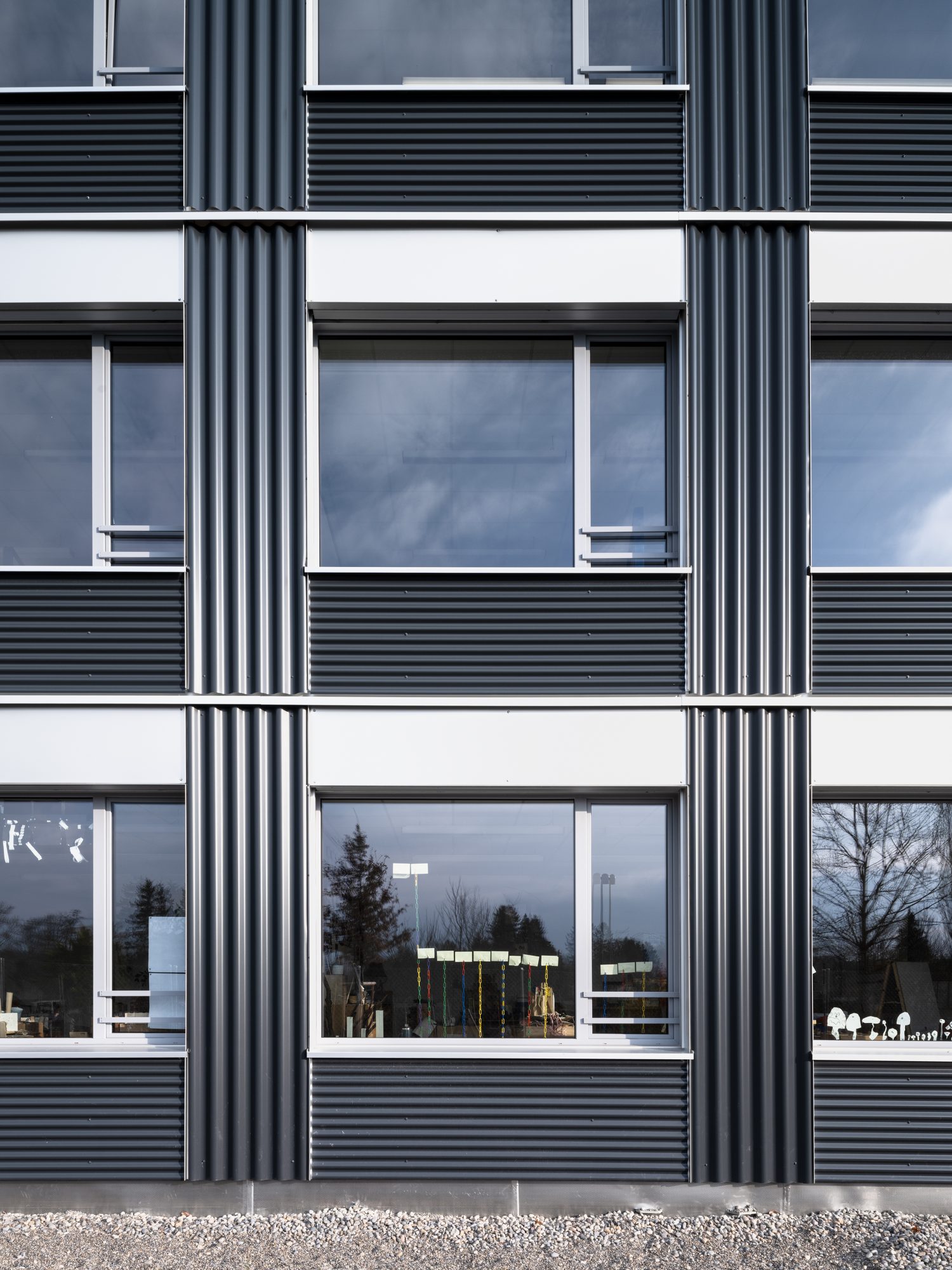 Das neue Gebäude wurde als hybrider Modulbau erstellt: Die Raummodule bestehen aus einem Betonboden, Stahltragwerk und Aussenwänden aus Holzelementen. Durch den hohen Vorfertigungsgrad im Werk der DM Bau in Oberriet war ein schneller Aufbau möglich – in nur zehn Tagen stand die komplette Struktur. Bis zum Abschluss des Innenausbaus vergingen knapp zwei Monate.
