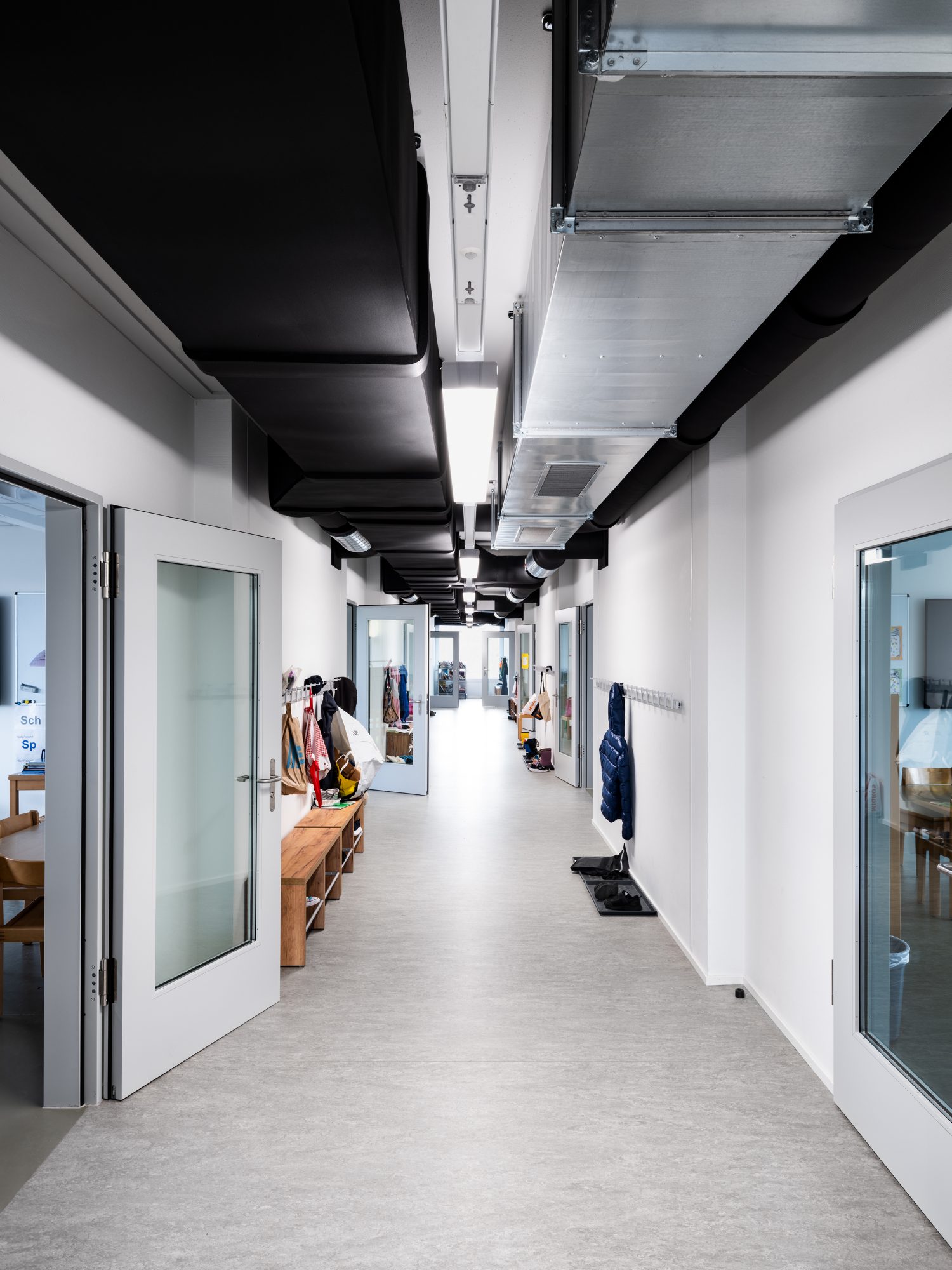 Die Klassenzimmer überzeugen mit einem klaren, funktionalen Grundriss. Die grosszügigen Fensterflächen sorgen mit viel Tageslicht für ein angenehmes Lernklima. Verbindungstüren zwischen den Zimmern erlauben flexible Raumkonzepte, während der zentrale Mittelgang sowohl als Durchgangszone wie auch als Aufenthaltsraum dient.